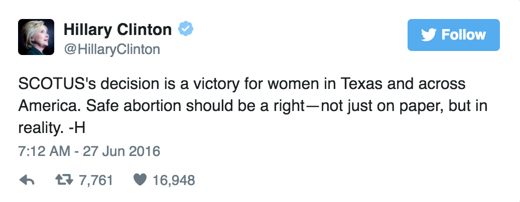 I can’t believe that in this day and age we’re still talking about and fighting over this. We have the right to have an abortion but those who oppose are always trying to make it hard for women to exercise that right. I will echo Hillary’s tweet: