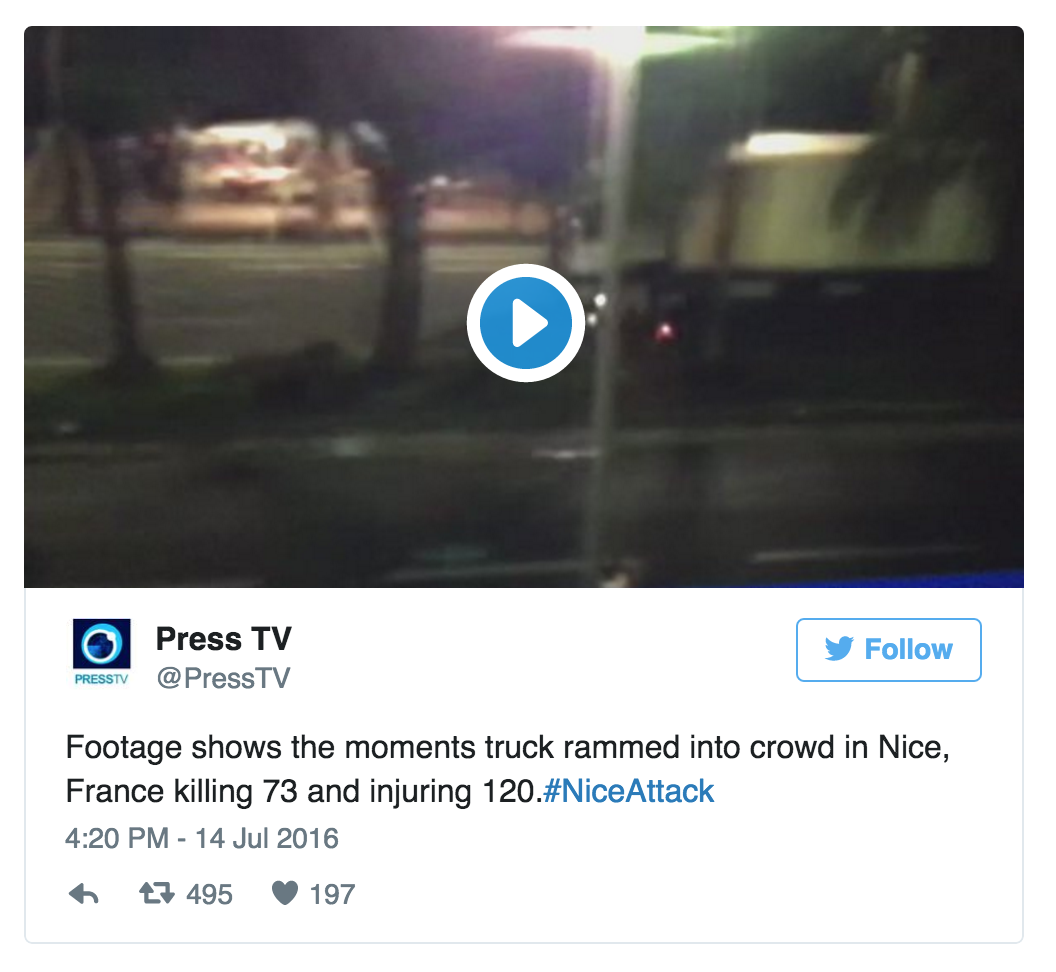 This time the attacker, who has now been identified, drove a truck filled with ammunition, shot out, and ran people over for more than a mile, killing 84 and injuring many people, a great deal in critical condition. At least 50 children are hospitalized. The driver, the attacker, was eventually killed by police.