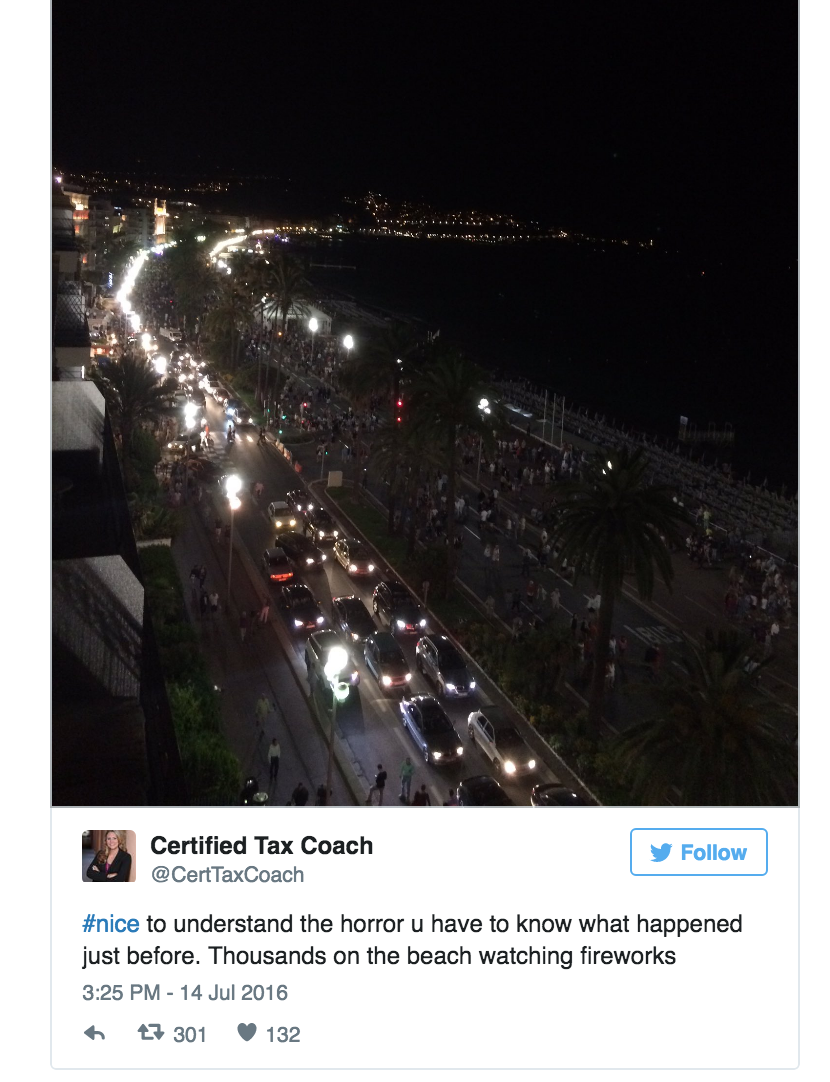 “Nobody in the way stood a chance,” Pierre Roux told the New York Times, recalling that there was no honking as the truck plowed through the terrified crowd.
