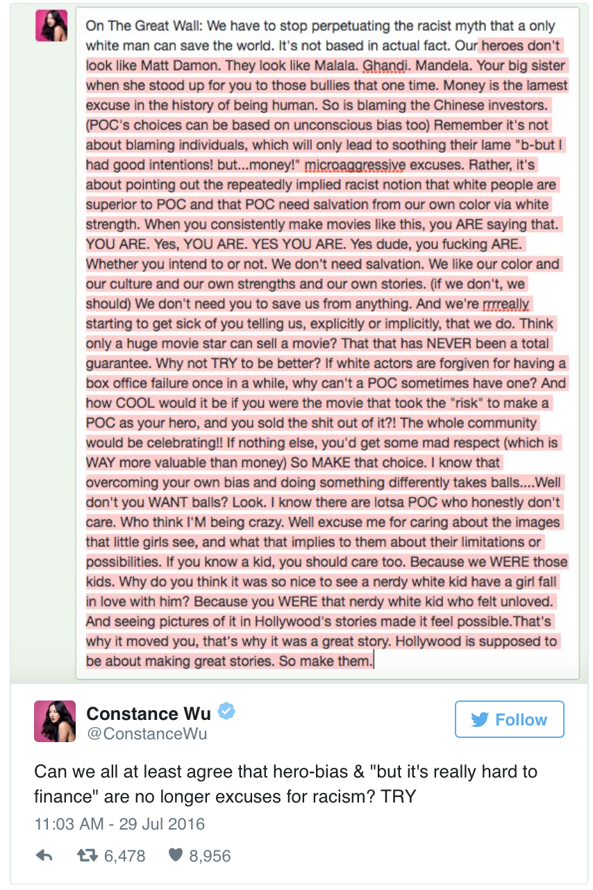 Constance Wu isn’t here for your excuses, equivocations, or apologies for Matt Damon’s upcoming film, The Great Wall, in which he stars as a heroic dragon-slayer defending the Great Wall in ancient China. (No, really.) “We have to stop perpetuating the racist myth that [only a] white man can save the world,” Wu writes in screenshot of her Twitter drafts. (Side thought: Is Twitter drafts the new Notes app?) “Our heroes don’t look like Matt Damon. They look like Malala. Ghandi. Mandela. Your big sister when she stood up for you to those bullies that one time.”