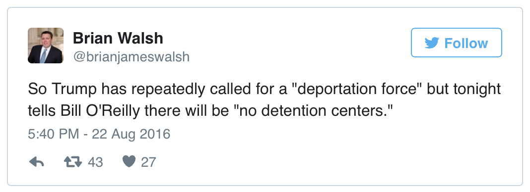 Trump also told the Fox News host that he would not make use of detention centers, though it’s as yet unclear where undocumented immigrants would be held if he were to use a deportation task force to round them up.
