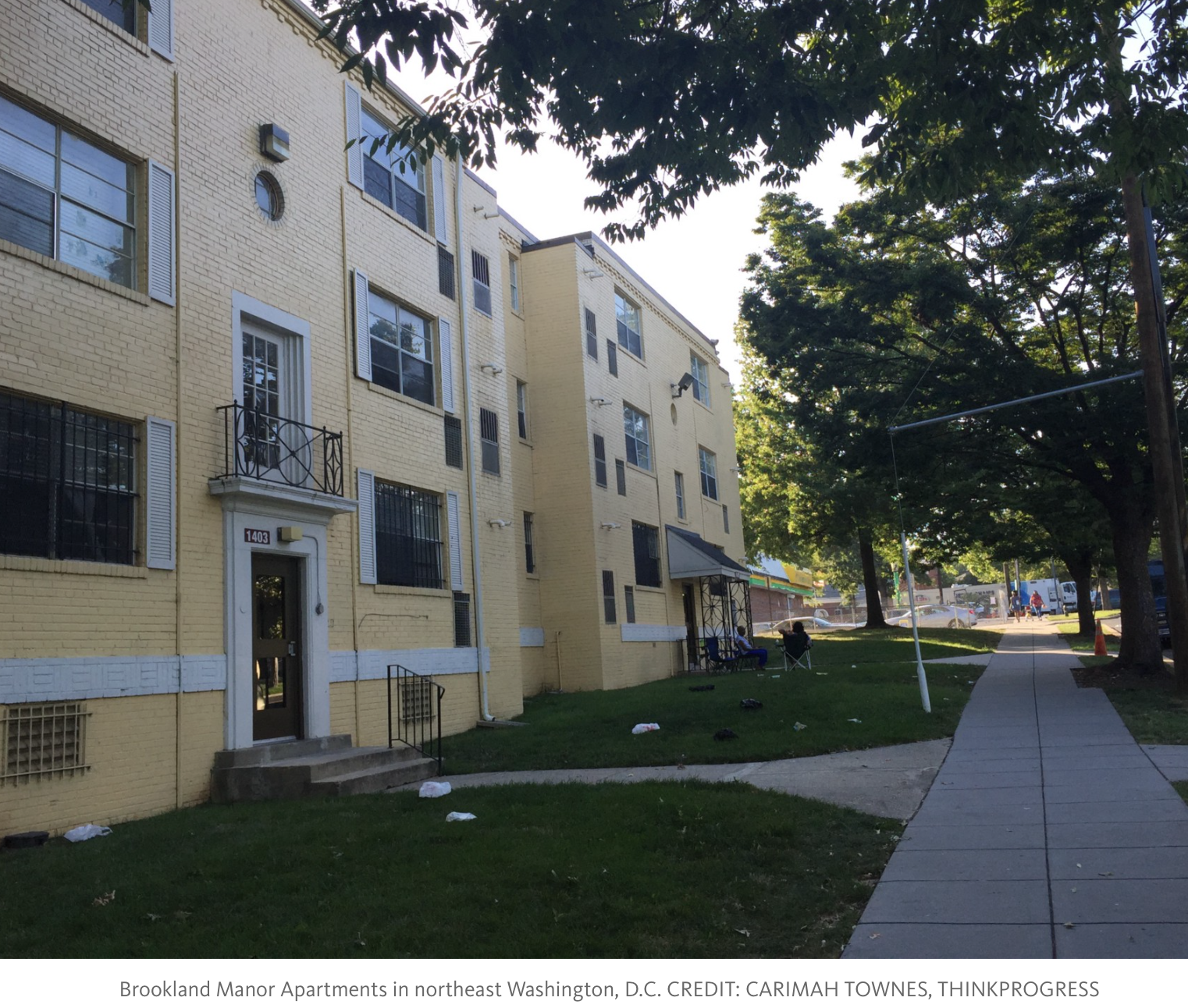 To understand this dynamic, one only needs to visit Brookland Manor, an affordable housing complex made up of 535 units in Northeast D.C. The property owner, Mid-City Financial, wants to demolish and rebuild the property, and housing lawyers contend that it hired special officers to intimidate residents and force them to leave. Mid-City Financial did not respond to request for comment on these allegations.