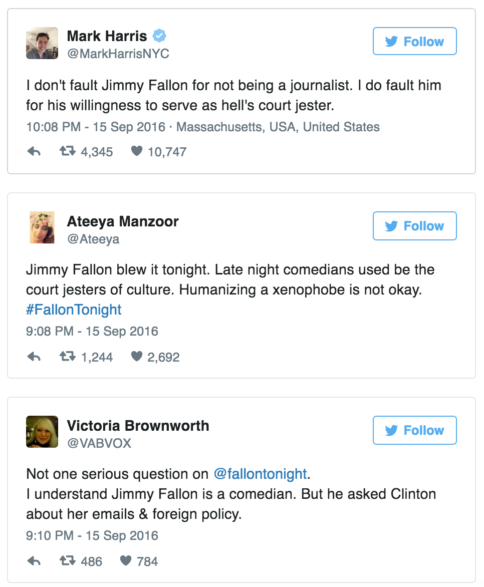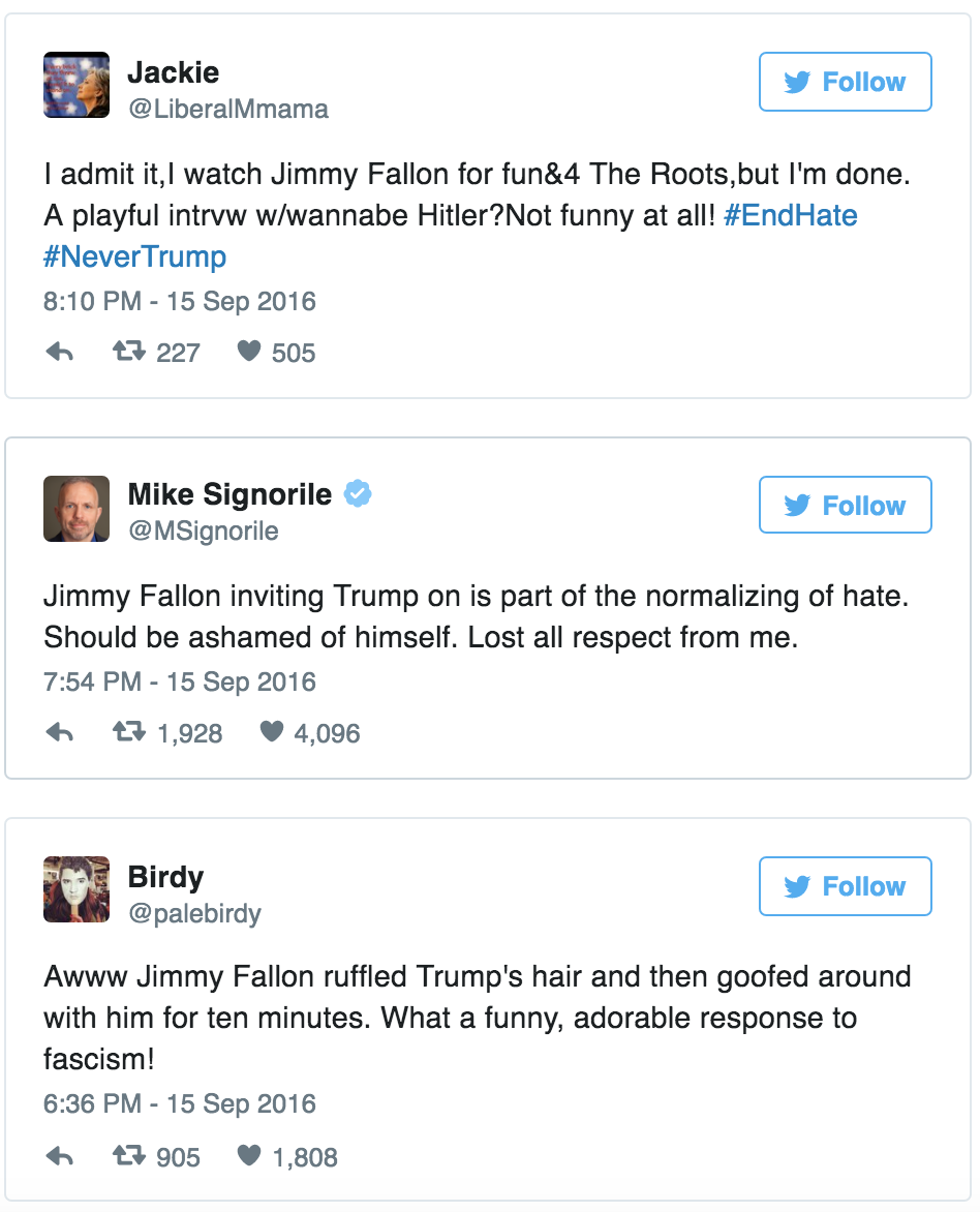 Fallon is taking a beating for this move on social media. Like Matt Lauer who allowed Trump to blatantly lie without interruption on the Commander in Chief Forum, these talk show hosts are contributing to the possible election of a horrible man. Here are some Twitter reactions to last night’s show: