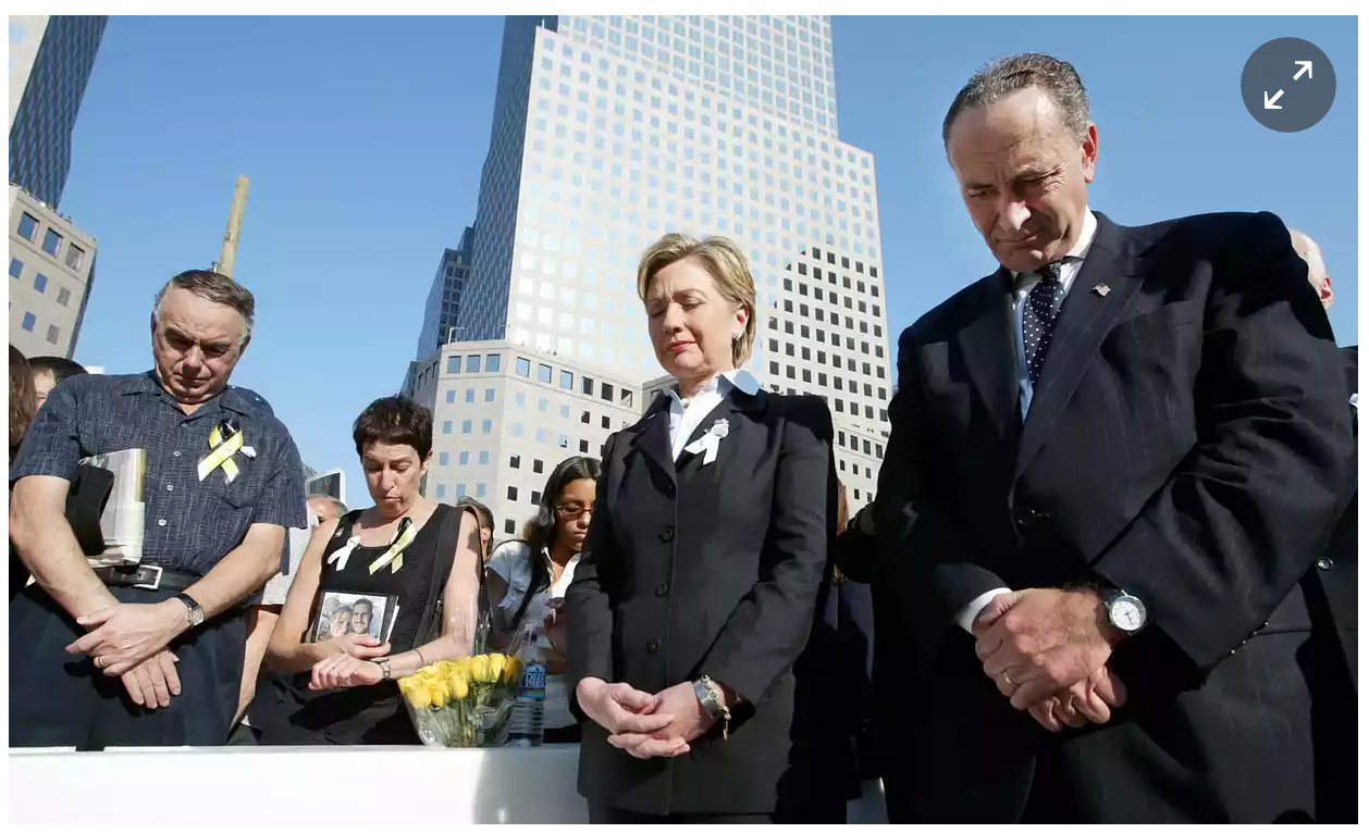 Hillary Clinton and Charles Schumer bow their heads during a moment of silence at Ground Zero. Photograph: Ruth Fremson/AP